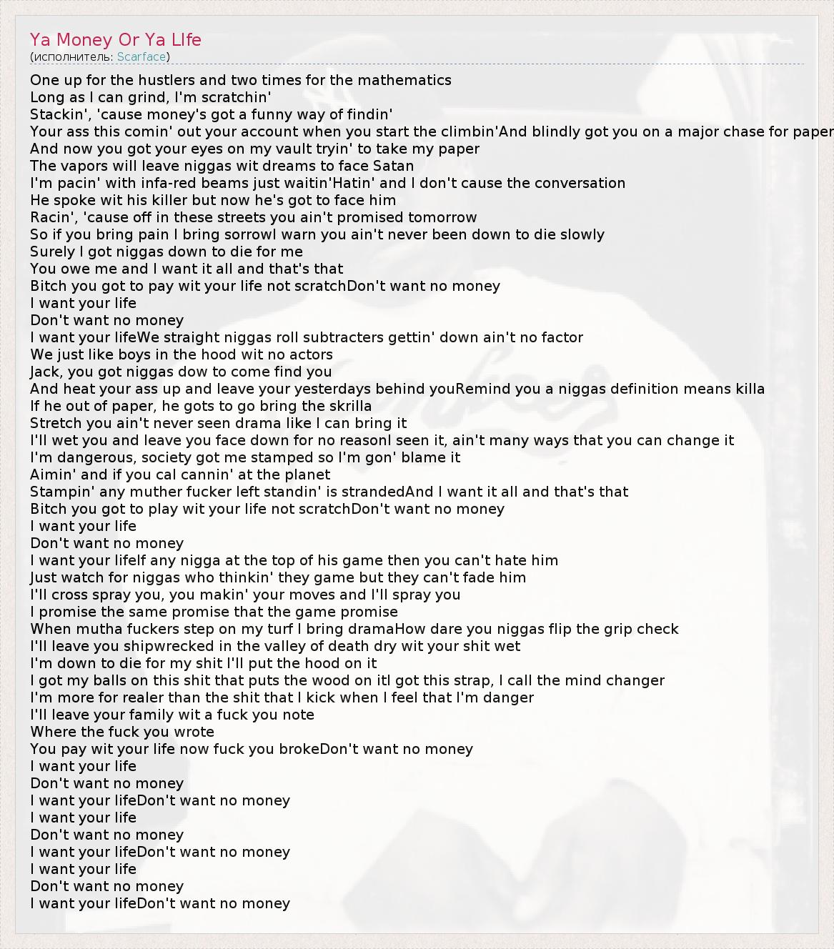 А как ты думаешь, о чем песня "Ya Money Or Ya LIfe" ?