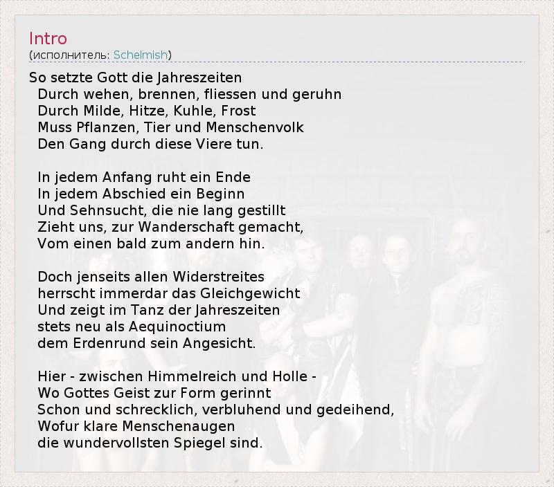 Это интересно:Schelmish – это ещё один представитель немецкой фолк тусовки. Группа также как и все прочие ей подобные начинала с исполнения "чистого" средневекового фолка, т. е. ребята играли произведения из Кармины Бураны и прочее в том же духе (отсюда в их репертуаре и Ai Vis Lo Lop и Palästinalied). Идея же создать ансамбль песни и пляски играющий на постоянной основе, пришла после успешного выступления на... продолжение
