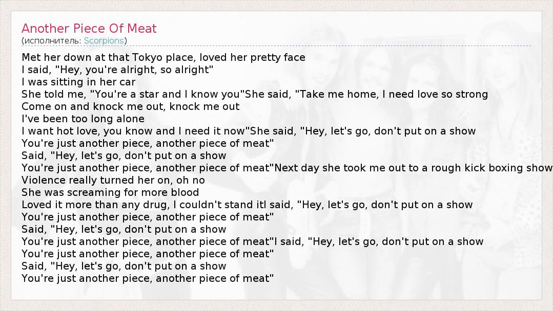 А как ты думаешь, о чем песня "Another Piece Of Meat" ?