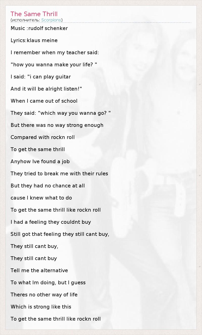 Music :rudolf schenker Lyrics:klaus meine I remember when my teacher said: "how you wanna make your life? " I said: "i can play guitar And it will be alright listen!" When I came out of school They said: "which way you wanna go? " But there was no way strong enough Compared with rockn roll To get the same thrill Anyhow Ive found a job They tried to break me with their rules But they had no chance at all cause I knew what to do To get the same thrill like rockn roll I had a feeling they couldnt buy Still got that feeling they still cant buy, They still cant buy, They still cant buy Tell me the alternative To what Im doing, but I guess Theres no other way of life Which is strong like this To get the same thrill like rockn roll