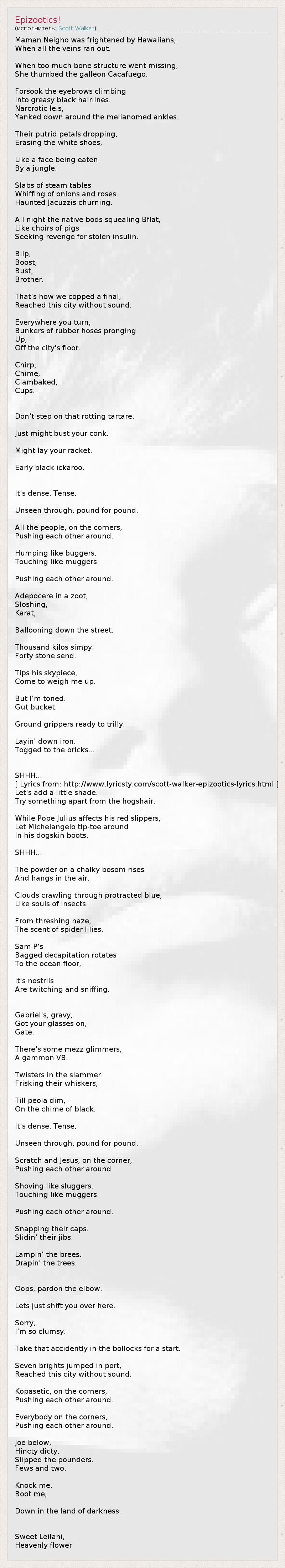 [ Lyrics from: http://www.lyricsty.com/scott-walker-epizootics-lyrics.html ]