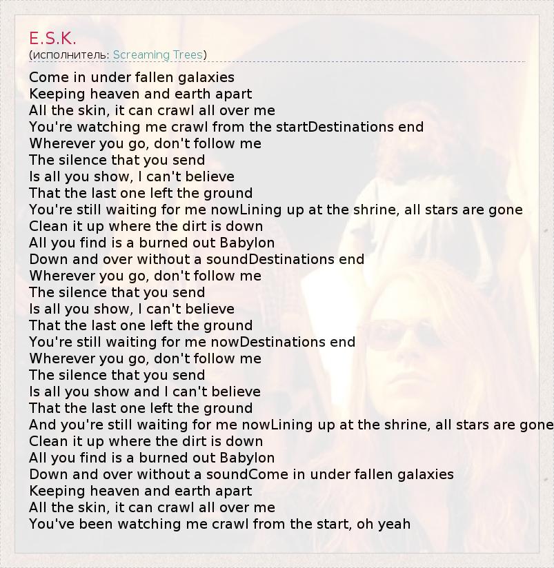 Come in under fallen galaxies Keeping heaven and earth apart All the skin, it can crawl all over me You're watching me crawl from the startDestinations end Wherever you go, don't follow me The silence that you send Is all you show, I can't believe That the last one left the ground You're still waiting for me nowLining up at the shrine, all stars are gone Clean it up where the dirt is down All you find is a burned out Babylon Down and over without a soundDestinations end Wherever you go, don't follow me The silence that you send Is all you show, I can't believe That the last one left the ground You're still waiting for me nowDestinations end Wherever you go, don't follow me The silence that you send Is all you show and I can't believe That the last one left the ground And you're still waiting for me nowLining up at the shrine, all stars are gone Clean it up where the dirt is down All you find is a burned out Babylon Down and over without a soundCome in under fallen galaxies Keeping heaven and earth apart All the skin, it can crawl all over me You've been watching me crawl from the start, oh yeah