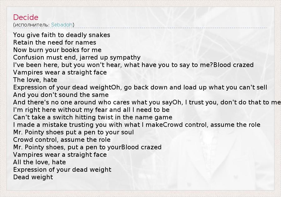 You give faith to deadly snakes Retain the need for names Now burn your books for me Confusion must end, jarred up sympathy I've been here, but you won't hear, what have you to say to me?Blood crazed Vampires wear a straight face The love, hate Expression of your dead weightOh, go back down and load up what you can't sell And you don't sound the same And there's no one around who cares what you sayOh, I trust you, don't do that to me I'm right here without my fear and all I need to be Can't take a switch hitting twist in the name game I made a mistake trusting you with what I makeCrowd control, assume the role Mr. Pointy shoes put a pen to your soul Crowd control, assume the role Mr. Pointy shoes, put a pen to yourBlood crazed Vampires wear a straight face All the love, hate Expression of your dead weight Dead weight