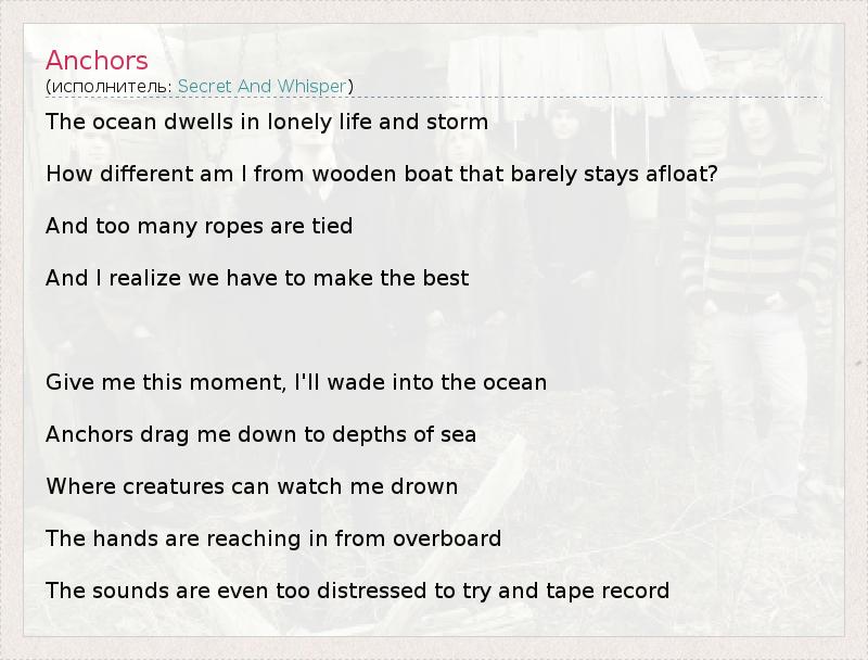 The ocean dwells in lonely life and storm How different am I from wooden boat that barely stays afloat? And too many ropes are tied And I realize we have to make the best Give me this moment, I'll wade into the ocean Anchors drag me down to depths of sea Where creatures can watch me drown The hands are reaching in from overboard The sounds are even too distressed to try and tape record