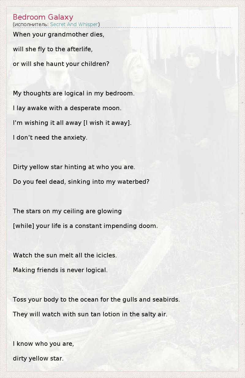 When your grandmother dies, will she fly to the afterlife, or will she haunt your children? My thoughts are logical in my bedroom. I lay awake with a desperate moon. I'm wishing it all away [I wish it away]. I don't need the anxiety. Dirty yellow star hinting at who you are. Do you feel dead, sinking into my waterbed? The stars on my ceiling are glowing [while] your life is a constant impending doom. Watch the sun melt all the icicles. Making friends is never logical. Toss your body to the ocean for the gulls and seabirds. They will watch with sun tan lotion in the salty air. I know who you are, dirty yellow star.