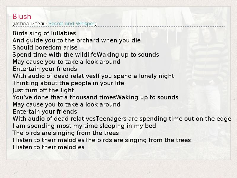 Birds sing of lullabies And guide you to the orchard when you die Should boredom arise Spend time with the wildlifeWaking up to sounds May cause you to take a look around Entertain your friends With audio of dead relativesIf you spend a lonely night Thinking about the people in your life Just turn off the light You've done that a thousand timesWaking up to sounds May cause you to take a look around Entertain your friends With audio of dead relativesTeenagers are spending time out on the edge I am spending most my time sleeping in my bed The birds are singing from the trees I listen to their melodiesThe birds are singing from the trees I listen to their melodies