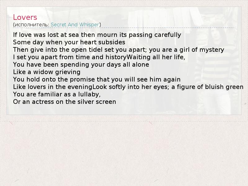 Lovers is a story about the adoption of Charles' mom. There was a naval sailor who was home for one night and met a married girl. They ended up having an affair that night and she got pregnant. The women went home, and her husband said she couldn't keep the baby because it wasn't his. That baby was Charles' mom.