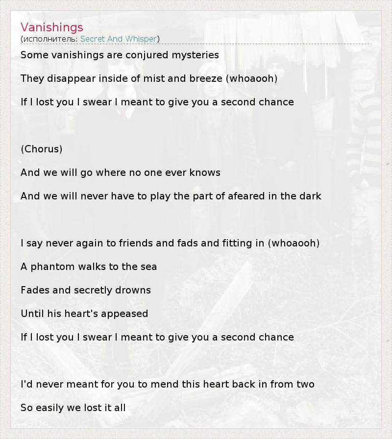 Some vanishings are conjured mysteries They disappear inside of mist and breeze (whoaooh) If I lost you I swear I meant to give you a second chance (Chorus) And we will go where no one ever knows And we will never have to play the part of afeared in the dark I say never again to friends and fads and fitting in (whoaooh) A phantom walks to the sea Fades and secretly drowns Until his heart's appeased If I lost you I swear I meant to give you a second chance I'd never meant for you to mend this heart back in from two So easily we lost it all