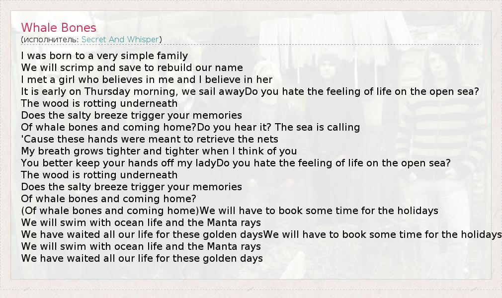 А как ты думаешь, о чем песня "Whale Bones" ?