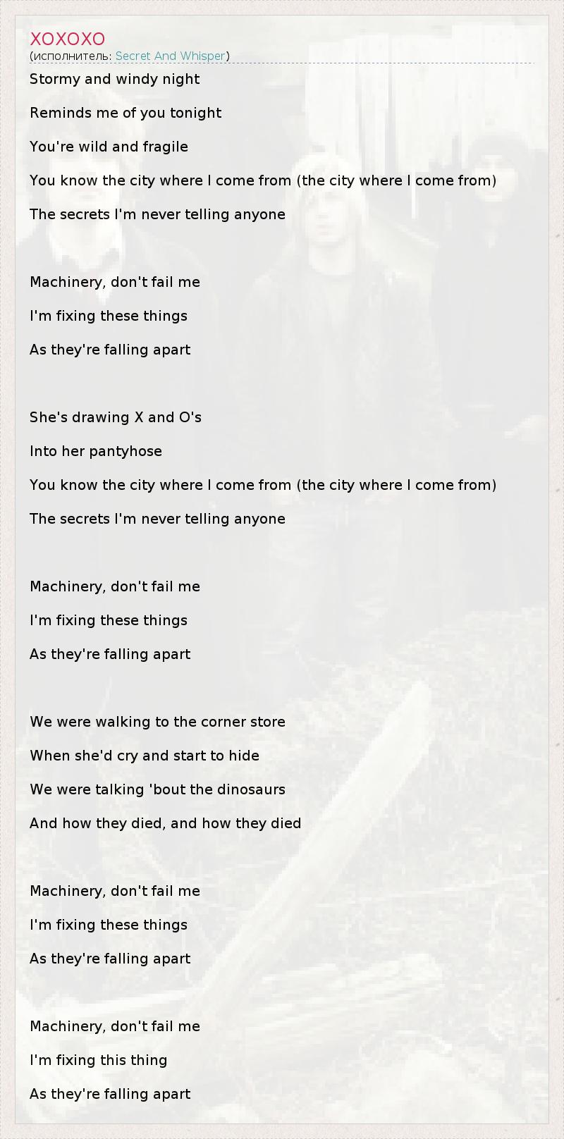 Stormy and windy night Reminds me of you tonight You're wild and fragile You know the city where I come from (the city where I come from) The secrets I'm never telling anyone Machinery, don't fail me I'm fixing these things As they're falling apart She's drawing X and O's Into her pantyhose You know the city where I come from (the city where I come from) The secrets I'm never telling anyone Machinery, don't fail me I'm fixing these things As they're falling apart We were walking to the corner store When she'd cry and start to hide We were talking 'bout the dinosaurs And how they died, and how they died Machinery, don't fail me I'm fixing these things As they're falling apart Machinery, don't fail me I'm fixing this thing As they're falling apart