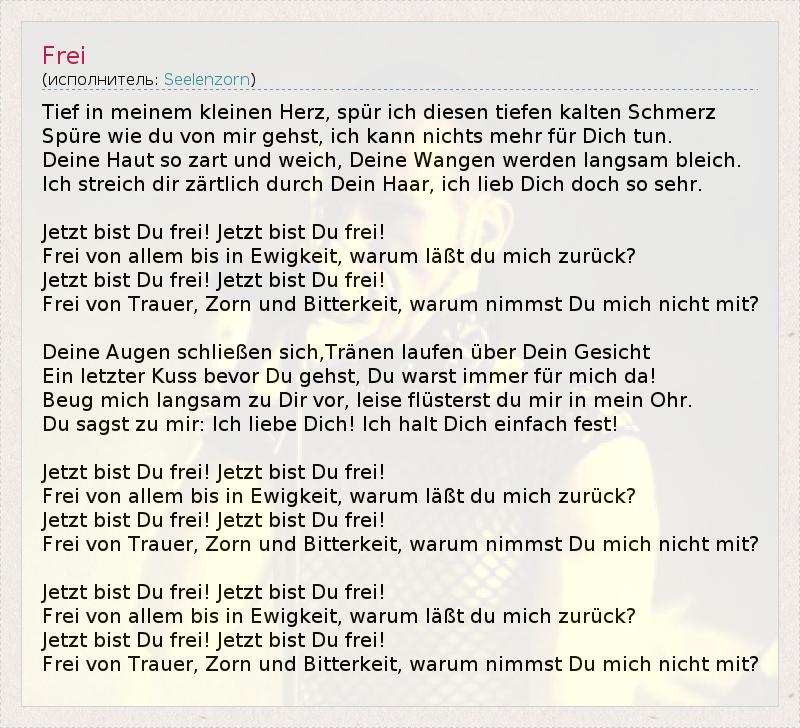 Это интересно:Seelenzorn (Ярость души) – это удачный, цепляющий за живое музыкальный коктейль из двух разных, но столь удачно подобранных компонентов – мрачного мелодичного поп-саунда и индустриального рока. Изданные никем иным, как Бруно Краммом (Das Ich) для европейского рынка два альбома Seelenzorn и выступления на крупнейших альтернативных и готических фестивалях Старого Света, принесли им статус культовой... продолжение