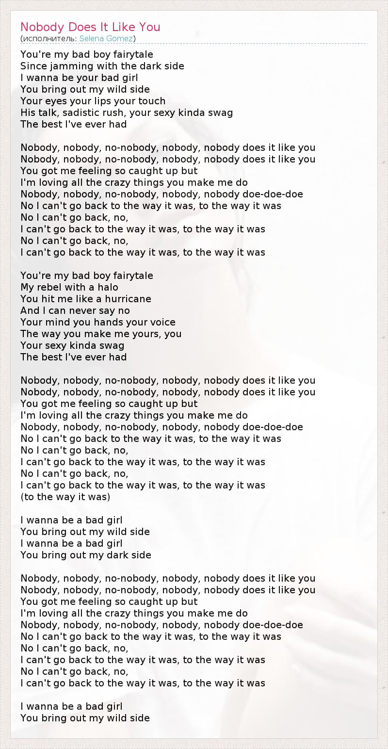 You're my bad boy fairytale Since jamming with the dark side I wanna be your bad girl You bring out my wild side Your eyes your lips your touch His talk, sadistic rush, your sexy kinda swag The best I've ever had Nobody, nobody, no-nobody, nobody, nobody does it like you Nobody, nobody, no-nobody, nobody, nobody does it like you You got me feeling so caught up but I'm loving all the crazy things you make me do Nobody, nobody, no-nobody, nobody, nobody doe-doe-doe No I can't go back to the way it was, to the way it was No I can't go back, no, I can't go back to the way it was, to the way it was No I can't go back, no, I can't go back to the way it was, to the way it was You're my bad boy fairytale My rebel with a halo You hit me like a hurricane And I can never say no Your mind you hands your voice The way you make me yours, you Your sexy kinda swag The best I've ever had Nobody, nobody, no-nobody, nobody, nobody does it like you Nobody, nobody, no-nobody, nobody, nobody does it like you You got me feeling so caught up but I'm loving all the crazy things you make me do Nobody, nobody, no-nobody, nobody, nobody doe-doe-doe No I can't go back to the way it was, to the way it was No I can't go back, no, I can't go back to the way it was, to the way it was No I can't go back, no, I can't go back to the way it was, to the way it was (to the way it was) I wanna be a bad girl You bring out my wild side I wanna be a bad girl You bring out my dark side Nobody, nobody, no-nobody, nobody, nobody does it like you Nobody, nobody, no-nobody, nobody, nobody does it like you You got me feeling so caught up but I'm loving all the crazy things you make me do Nobody, nobody, no-nobody, nobody, nobody doe-doe-doe No I can't go back to the way it was, to the way it was No I can't go back, no, I can't go back to the way it was, to the way it was No I can't go back, no, I can't go back to the way it was, to the way it was I wanna be a bad girl You bring out my wild side