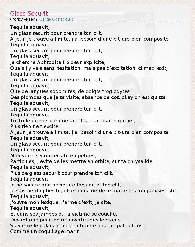 Tequila aquavit, Un glass securit pour prendre ton clit, A jeun je trouve a limite, j'ai besoin d'une bit-ure bien composite Tequila aquavit, Un glass securit pour prendre ton clit, Tequila aquavit, Je cherche Aphrodite froideur explicite, Ouais j'y vais sans hesitation, mais pas d'excitation, climax, exit, Tequila aquavit, Un glass securit pour prendre ton clit, Tequila aquavit, Que de langues sodomites, de doigts troglodytes, Des plombes que je te visite, absence de cot, okey on est quitte, Tequila aquavit, Un glass securit pour prendre ton clit, Tequila aquavit, Toi tu le prends comme un rit-uel un plan habituel, Plus rien ne t'excite, A jeun je trouve a limite, j'ai besoin d'une bit-ure bien composite Tequila aquavit, Un glass securit pour prendre ton clit, Tequila aquavit, Mon verre securit eclate en petites, Particules, j'evite de les mettre en orbite, sur ta chrysalide, Tequila aquavit, Plus de glass securit pour prendre ton clit, Tequila aquavit, Je ne sais ce que necessite ton con et ton clit, Je suis perdu j'hesite, oh et puis merde je quitte tes muqueuses, shit Tequila aquavit, J'ouvre mon lexique, l'arme d'exit, je cite, Tequila aquavit, Et dans ses jambes ou la victime se couche, Devant une peau noire ouverte sous le crane, S'avance le palais de cette etrange bouche pale et rose, Comme un coquillage marin.