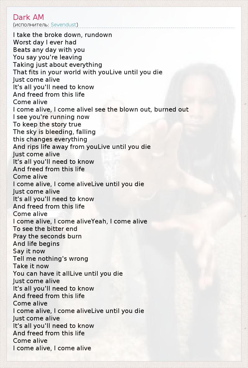 I take the broke down, rundown Worst day I ever had Beats any day with you You say you're leaving Taking just about everything That fits in your world with youLive until you die Just come alive It's all you'll need to know And freed from this life Come alive I come alive, I come aliveI see the blown out, burned out I see you're running now To keep the story true The sky is bleeding, falling this changes everything And rips life away from youLive until you die Just come alive It's all you'll need to know And freed from this life Come alive I come alive, I come aliveLive until you die Just come alive It's all you'll need to know And freed from this life Come alive I come alive, I come aliveYeah, I come alive To see the bitter end Pray the seconds burn And life begins Say it now Tell me nothing's wrong Take it now You can have it allLive until you die Just come alive It's all you'll need to know And freed from this life Come alive I come alive, I come aliveLive until you die Just come alive It's all you'll need to know And freed from this life Come alive I come alive, I come alive