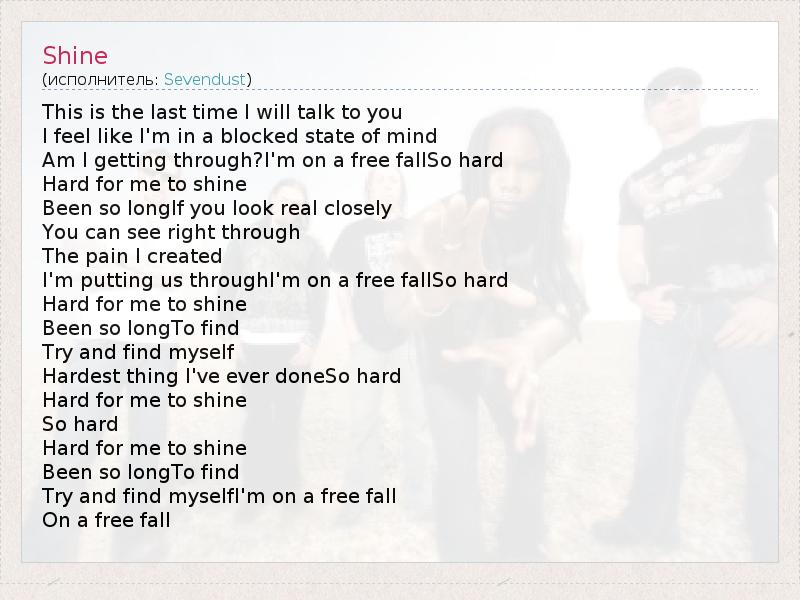 This is the last time I will talk to you I feel like I'm in a blocked state of mind Am I getting through?I'm on a free fallSo hard Hard for me to shine Been so longIf you look real closely You can see right through The pain I created I'm putting us throughI'm on a free fallSo hard Hard for me to shine Been so longTo find Try and find myself Hardest thing I've ever doneSo hard Hard for me to shine So hard Hard for me to shine Been so longTo find Try and find myselfI'm on a free fall On a free fall