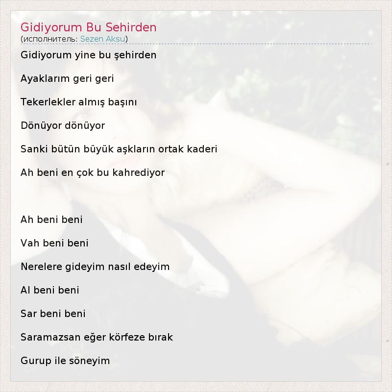Gidiyorum yine bu şehirden Ayaklarım geri geri Tekerlekler almış başını Dönüyor dönüyor Sanki bütün büyük aşkların ortak kaderi Ah beni en çok bu kahrediyor Ah beni beni Vah beni beni Nerelere gideyim nasıl edeyim Al beni beni Sar beni beni Saramazsan eğer körfeze bırak Gurup ile söneyim