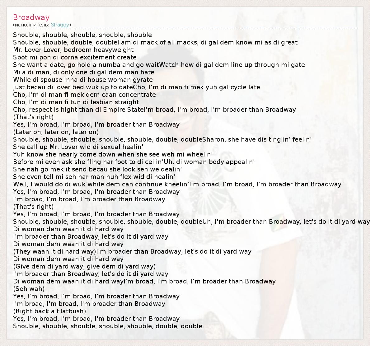 Shouble, shouble, shouble, shouble, shouble Shouble, shouble, double, doubleI am di mack of all macks, di gal dem know mi as di great Mr. Lover Lover, bedroom heavyweight Spot mi pon di corna excitement create She want a date, go hold a numba and go waitWatch how di gal dem line up through mi gate Mi a di man, di only one di gal dem man hate While di spouse inna di house woman gyrate Just becau di lover bed wuk up to dateCho, I'm di man fi mek yuh gal cycle late Cho, I'm di man fi mek dem caan concentrate Cho, I'm di man fi tun di lesbian straight Cho, respect is hight than di Empire StateI'm broad, I'm broad, I'm broader than Broadway (That's right) Yes, I'm broad, I'm broad, I'm broader than Broadway (Later on, later on, later on) Shouble, shouble, shouble, shouble, shouble, double, doubleSharon, she have dis tinglin' feelin' She call up Mr. Lover wid di sexual healin' Yuh know she nearly come down when she see weh mi wheelin' Before mi even ask she fling har foot to di ceilin'Uh, di woman body appealin' She nah go mek it send becau she look seh we dealin' She even tell mi seh har man nuh flex wid di healin' Well, I would do di wuk while dem can continue kneelin'I'm broad, I'm broad, I'm broader than Broadway Yes, I'm broad, I'm broad, I'm broader than Broadway I'm broad, I'm broad, I'm broader than Broadway (That's right) Yes, I'm broad, I'm broad, I'm broader than Broadway Shouble, shouble, shouble, shouble, shouble, double, doubleUh, I'm broader than Broadway, let's do it di yard way Di woman dem waan it di hard way I'm broader than Broadway, let's do it di yard way Di woman dem waan it di hard way (They waan it di hard way)I'm broader than Broadway, let's do it di yard way Di woman dem waan it di hard way (Give dem di yard way, give dem di yard way) I'm broader than Broadway, let's do it di yard way Di woman dem waan it di hard wayI'm broad, I'm broad, I'm broader than Broadway (Seh wah) Yes, I'm broad, I'm broad, I'm broader than Broadway I'm broad, I'm broad, I'm broader than Broadway (Right back a Flatbush) Yes, I'm broad, I'm broad, I'm broader than Broadway Shouble, shouble, shouble, shouble, shouble, double, double