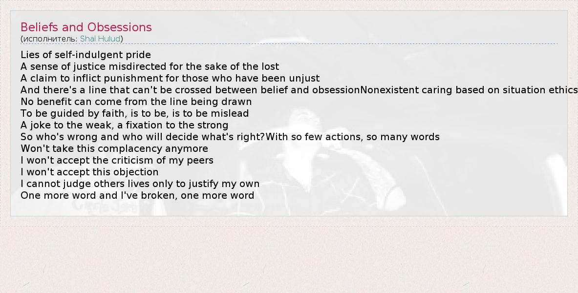 А как ты думаешь, о чем песня "Beliefs and Obsessions" ?