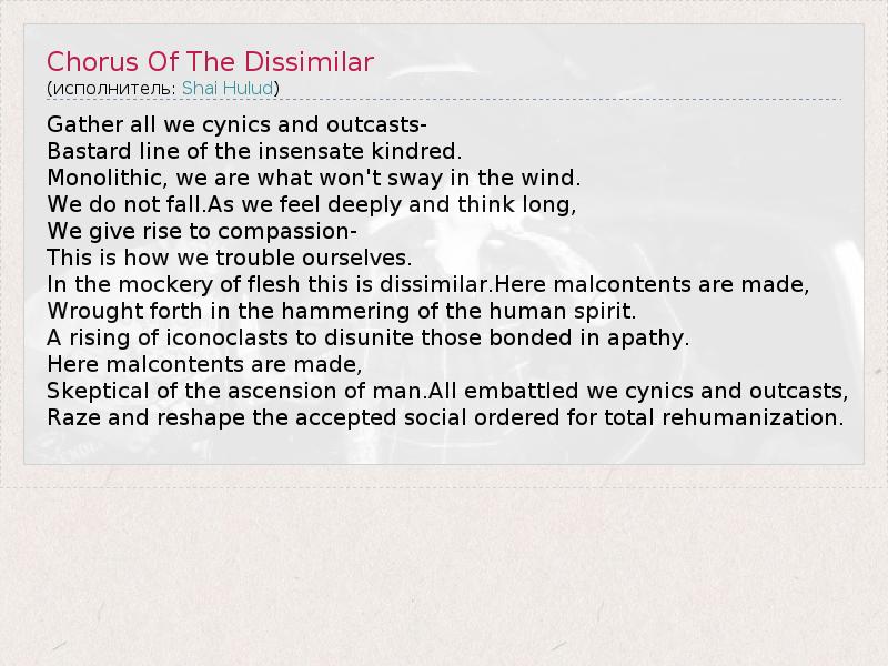 А как ты думаешь, о чем песня "Chorus Of The Dissimilar" ?