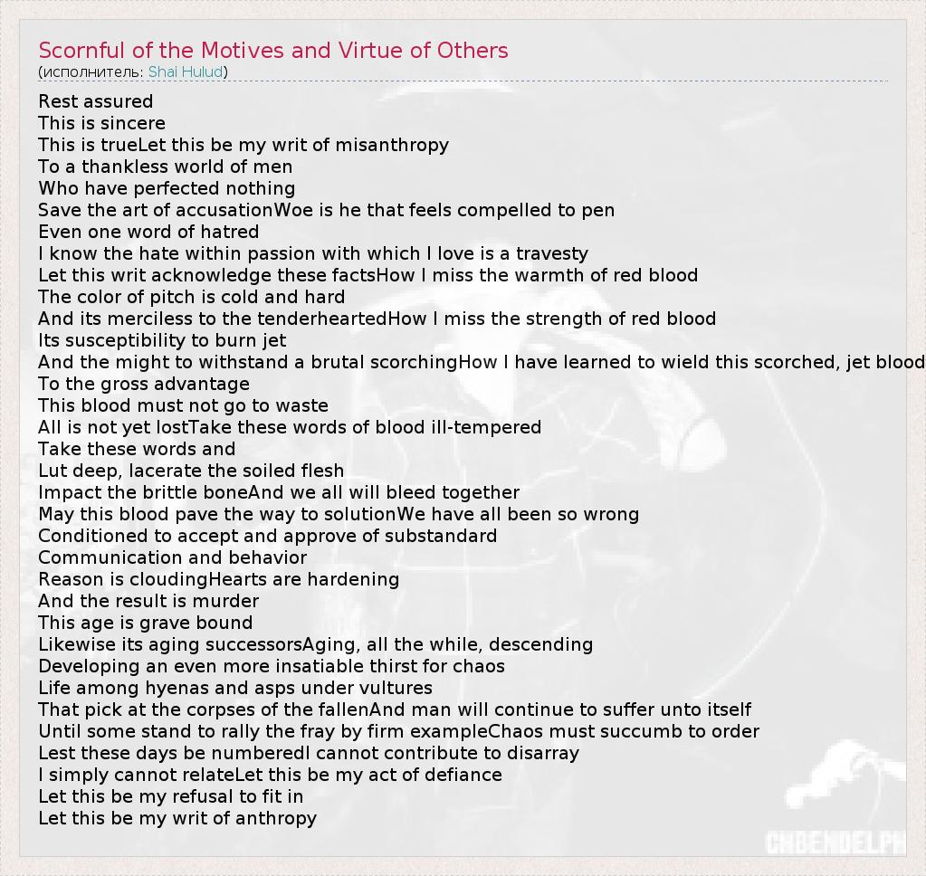 А как ты думаешь, о чем песня "Scornful of the Motives and Virtue of Others" ?
