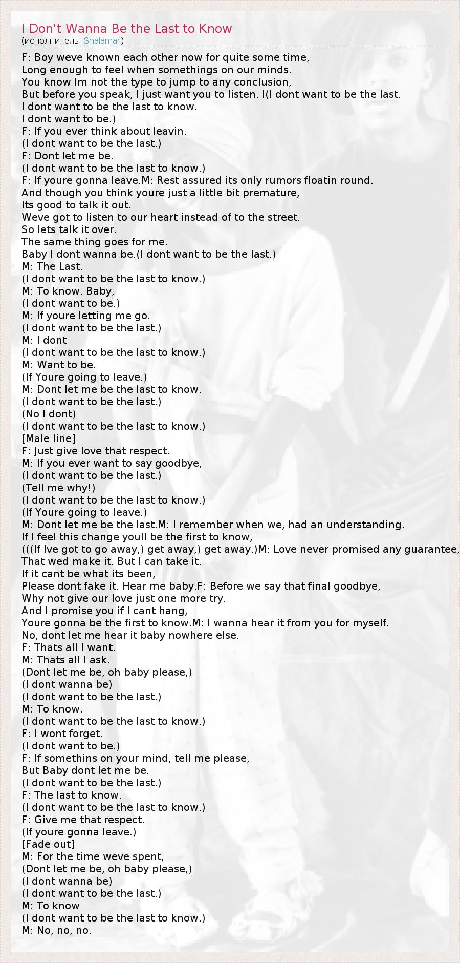 ГлавнаяИсполнителиShalamarI Don't Wanna Be the Last to Know