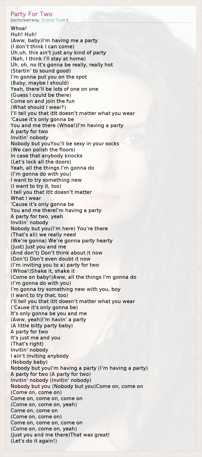 Это интересно:Шанайя Твейн (англ. Shania Twain; настоящее имя Э́йлин Реги́на Э́двардс; род. 28 августа 1965) — канадская певица, одна из наиболее успешных современных исполнителей кантри и поп-музыки. Её третий альбом «Come on Over» (1997) является третьим самым продаваемым альбомом всех времён, записанных женщиной, при этом он - на 7-м месте в общем списке самых продаваемых альбомов в истории музыки. У Твейн семь синглов,... продолжение