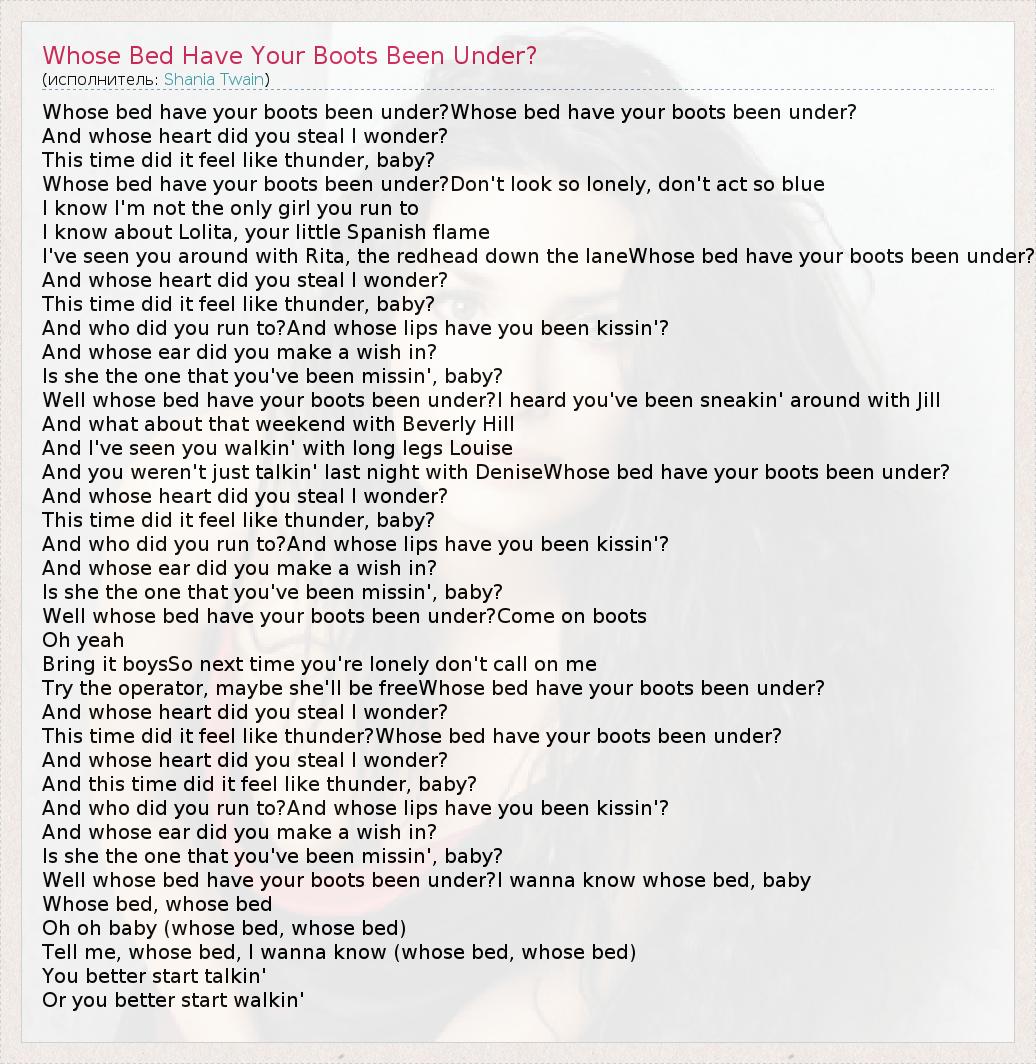 Whose bed have your boots been under?Whose bed have your boots been under? And whose heart did you steal I wonder? This time did it feel like thunder, baby? Whose bed have your boots been under?Don't look so lonely, don't act so blue I know I'm not the only girl you run to I know about Lolita, your little Spanish flame I've seen you around with Rita, the redhead down the laneWhose bed have your boots been under? And whose heart did you steal I wonder? This time did it feel like thunder, baby? And who did you run to?And whose lips have you been kissin'? And whose ear did you make a wish in? Is she the one that you've been missin', baby? Well whose bed have your boots been under?I heard you've been sneakin' around with Jill And what about that weekend with Beverly Hill And I've seen you walkin' with long legs Louise And you weren't just talkin' last night with DeniseWhose bed have your boots been under? And whose heart did you steal I wonder? This time did it feel like thunder, baby? And who did you run to?And whose lips have you been kissin'? And whose ear did you make a wish in? Is she the one that you've been missin', baby? Well whose bed have your boots been under?Come on boots Oh yeah Bring it boysSo next time you're lonely don't call on me Try the operator, maybe she'll be freeWhose bed have your boots been under? And whose heart did you steal I wonder? This time did it feel like thunder?Whose bed have your boots been under? And whose heart did you steal I wonder? And this time did it feel like thunder, baby? And who did you run to?And whose lips have you been kissin'? And whose ear did you make a wish in? Is she the one that you've been missin', baby? Well whose bed have your boots been under?I wanna know whose bed, baby Whose bed, whose bed Oh oh baby (whose bed, whose bed) Tell me, whose bed, I wanna know (whose bed, whose bed) You better start talkin' Or you better start walkin'