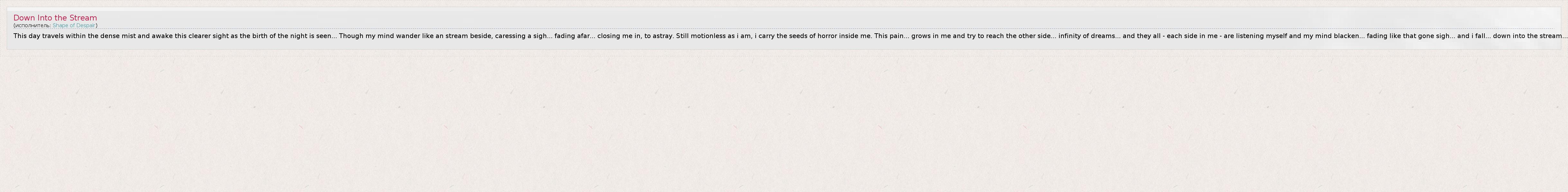 This day travels within the dense mist and awake this clearer sight as the birth of the night is seen... Though my mind wander like an stream beside, caressing a sigh... fading afar... closing me in, to astray. Still motionless as i am, i carry the seeds of horror inside me. This pain... grows in me and try to reach the other side... infinity of dreams... and they all - each side in me - are listening myself and my mind blacken... fading like that gone sigh... and i fall... down into the stream...