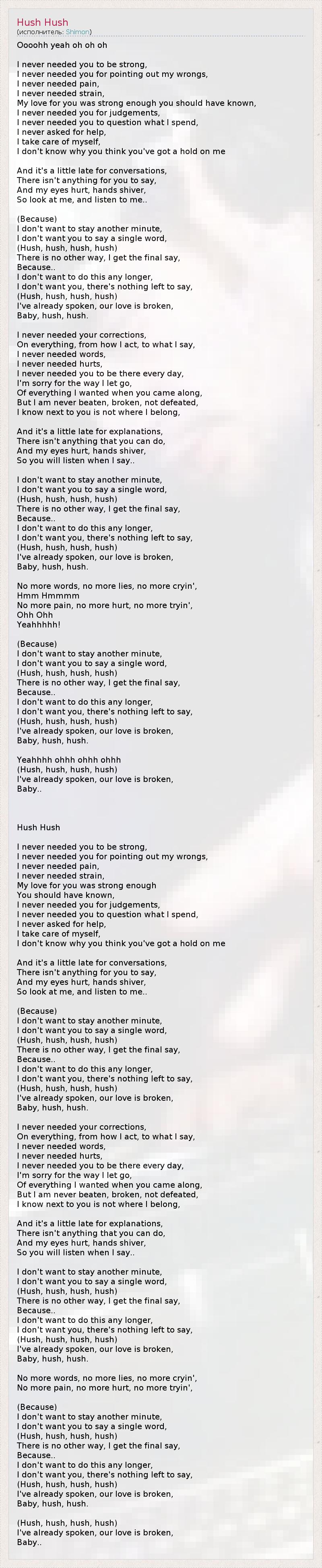 Oooohh yeah oh oh oh I never needed you to be strong, I never needed you for pointing out my wrongs, I never needed pain, I never needed strain, My love for you was strong enough you should have known, I never needed you for judgements, I never needed you to question what I spend, I never asked for help, I take care of myself, I don't know why you think you've got a hold on me And it's a little late for conversations, There isn't anything for you to say, And my eyes hurt, hands shiver, So look at me, and listen to me.. (Because) I don't want to stay another minute, I don't want you to say a single word, (Hush, hush, hush, hush) There is no other way, I get the final say, Because.. I don't want to do this any longer, I don't want you, there's nothing left to say, (Hush, hush, hush, hush) I've already spoken, our love is broken, Baby, hush, hush. I never needed your corrections, On everything, from how I act, to what I say, I never needed words, I never needed hurts, I never needed you to be there every day, I'm sorry for the way I let go, Of everything I wanted when you came along, But I am never beaten, broken, not defeated, I know next to you is not where I belong, And it's a little late for explanations, There isn't anything that you can do, And my eyes hurt, hands shiver, So you will listen when I say.. I don't want to stay another minute, I don't want you to say a single word, (Hush, hush, hush, hush) There is no other way, I get the final say, Because.. I don't want to do this any longer, I don't want you, there's nothing left to say, (Hush, hush, hush, hush) I've already spoken, our love is broken, Baby, hush, hush. No more words, no more lies, no more cryin', Hmm Hmmmm No more pain, no more hurt, no more tryin', Ohh Ohh Yeahhhhh! (Because) I don't want to stay another minute, I don't want you to say a single word, (Hush, hush, hush, hush) There is no other way, I get the final say, Because.. I don't want to do this any longer, I don't want you, there's nothing left to say, (Hush, hush, hush, hush) I've already spoken, our love is broken, Baby, hush, hush. Yeahhhh ohhh ohhh ohhh (Hush, hush, hush, hush) I've already spoken, our love is broken, Baby.. Hush Hush I never needed you to be strong, I never needed you for pointing out my wrongs, I never needed pain, I never needed strain, My love for you was strong enough You should have known, I never needed you for judgements, I never needed you to question what I spend, I never asked for help, I take care of myself, I don't know why you think you've got a hold on me And it's a little late for conversations, There isn't anything for you to say, And my eyes hurt, hands shiver, So look at me, and listen to me.. (Because) I don't want to stay another minute, I don't want you to say a single word, (Hush, hush, hush, hush) There is no other way, I get the final say, Because.. I don't want to do this any longer, I don't want you, there's nothing left to say, (Hush, hush, hush, hush) I've already spoken, our love is broken, Baby, hush, hush. I never needed your corrections, On everything, from how I act, to what I say, I never needed words, I never needed hurts, I never needed you to be there every day, I'm sorry for the way I let go, Of everything I wanted when you came along, But I am never beaten, broken, not defeated, I know next to you is not where I belong, And it's a little late for explanations, There isn't anything that you can do, And my eyes hurt, hands shiver, So you will listen when I say.. I don't want to stay another minute, I don't want you to say a single word, (Hush, hush, hush, hush) There is no other way, I get the final say, Because.. I don't want to do this any longer, I don't want you, there's nothing left to say, (Hush, hush, hush, hush) I've already spoken, our love is broken, Baby, hush, hush. No more words, no more lies, no more cryin', No more pain, no more hurt, no more tryin', (Because) I don't want to stay another minute, I don't want you to say a single word, (Hush, hush, hush, hush) There is no other way, I get the final say, Because.. I don't want to do this any longer, I don't want you, there's nothing left to say, (Hush, hush, hush, hush) I've already spoken, our love is broken, Baby, hush, hush. (Hush, hush, hush, hush) I've already spoken, our love is broken, Baby..