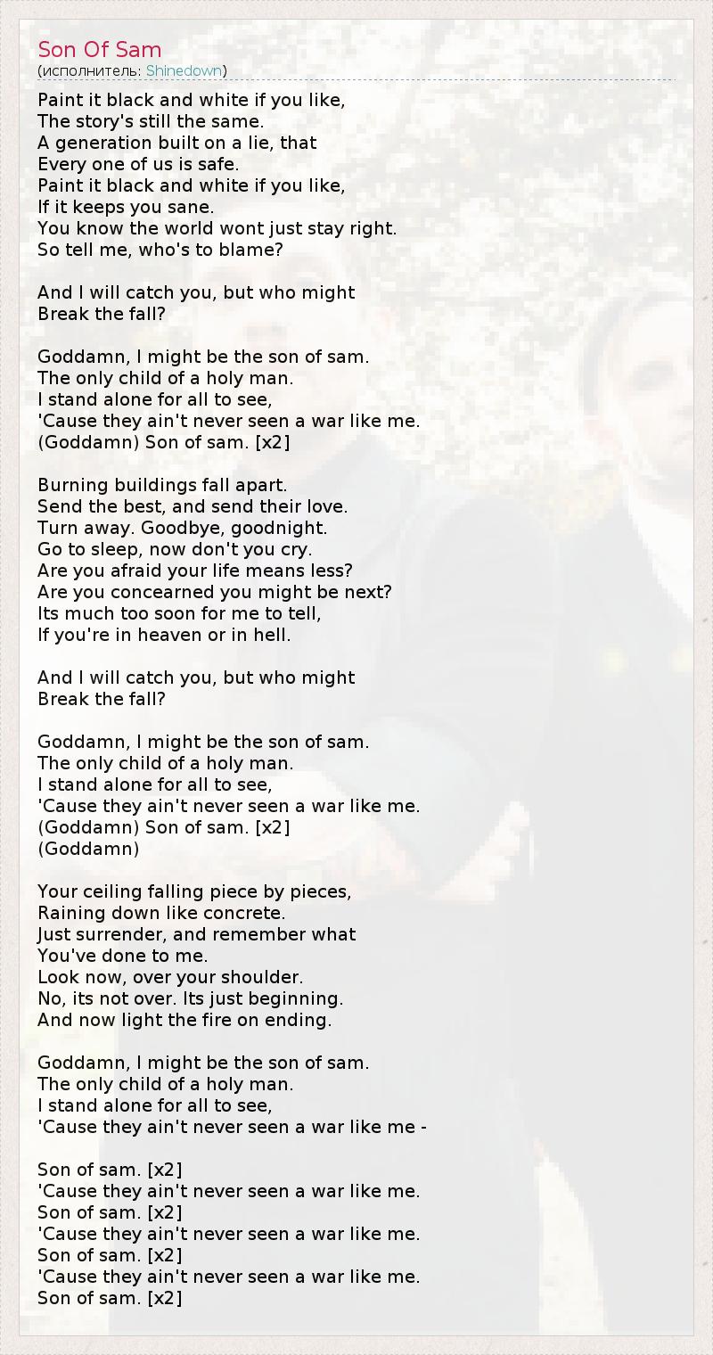 Нарисуй чёрно-белым если хочешь, История не изменится. Поколение построено на лжи, что Любой из нас безобиден. Нарисуй чёрно-белым если хочешь, Если ты в своём уме. Знаешь, мир не будет справедлив. Так скажи мне, кто виноват? И я настигну тебя, но кто сможет мне помешать? Черт возьми, я мог бы быть сыном Сэма. Единственным ребёнком святого человека. Я стою один у всех на виду, Потому что они никогда не видели войны, как я. (Черт возьми) Cыном Сэма. [x2] Горящие здания разваливаются. Напиши лучшее, и отправь их любовь. Отвернись. До свидания, спокойной ночи. Теперь иди спать и не плачь. Стал ли ты меньше бояться за свою жизнь? А что если ты будешь следующим? Слишком поздно об этом говорить, Если ты в раю или в аду. И я настигну тебя, но кто сможет мне помешать? Черт возьми, я мог бы быть сыном Сэма. Единственным ребёнком святого человека. Я стою один у всех на виду, Потому что они никогда не видели войны, как я. (Черт возьми) Cыном Сэма. [x2] (Черт возьми) Твой потолок сыпется на части, Он падает вниз как дождь. Просто сдайся, и помните, что Ты сделал для меня. Посмотри теперь, через плечо. Это ещё не конец. Всё только начинается. И теперь загорается последний огонь. Черт возьми, я мог бы быть сыном Сэма. Единственным ребёнком святого человека. Я стою один у всех на виду, Потому что они никогда не видели войны, как я. Cыном Сэма. [x2] Потому что они никогда не видели войны, как я. Cыном Сэма. [x2] Потому что они никогда не видели войны, как я. Cыном Сэма. [x2] Потому что они никогда не видели войны, как я. Cыном Сэма. [x2]