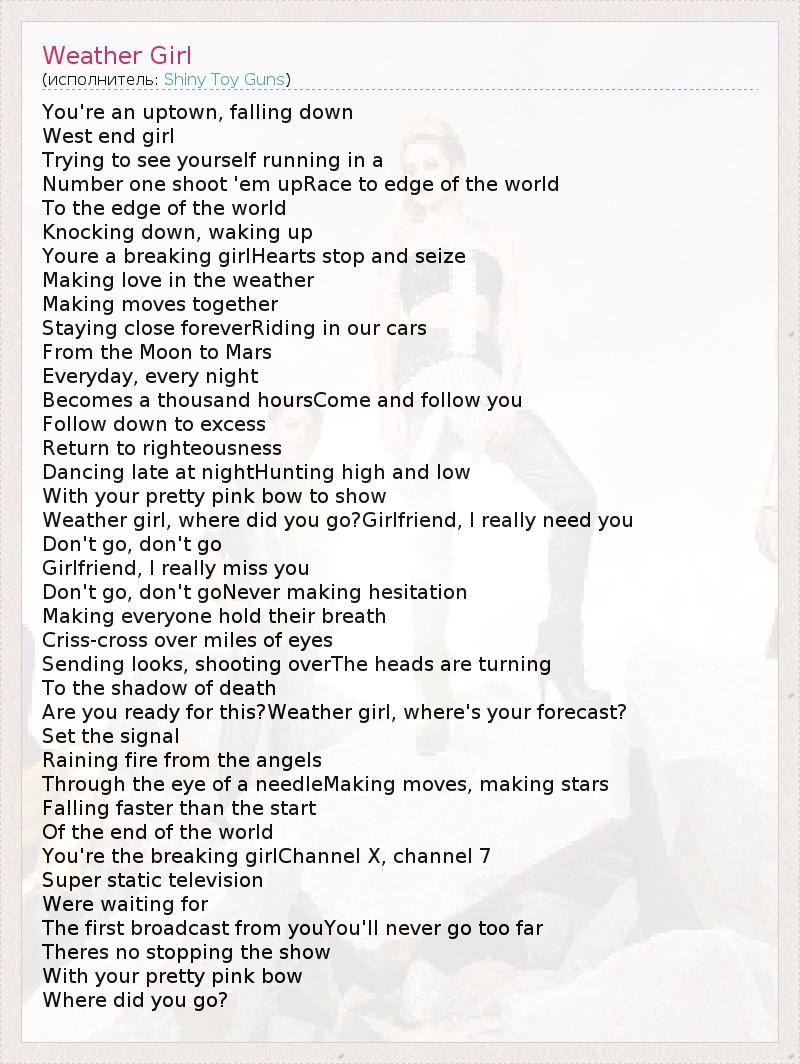 You're an uptown, falling down West end girl Trying to see yourself running in a Number one shoot 'em upRace to edge of the world To the edge of the world Knocking down, waking up Youre a breaking girlHearts stop and seize Making love in the weather Making moves together Staying close foreverRiding in our cars From the Moon to Mars Everyday, every night Becomes a thousand hoursCome and follow you Follow down to excess Return to righteousness Dancing late at nightHunting high and low With your pretty pink bow to show Weather girl, where did you go?Girlfriend, I really need you Don't go, don't go Girlfriend, I really miss you Don't go, don't goNever making hesitation Making everyone hold their breath Criss-cross over miles of eyes Sending looks, shooting overThe heads are turning To the shadow of death Are you ready for this?Weather girl, where's your forecast? Set the signal Raining fire from the angels Through the eye of a needleMaking moves, making stars Falling faster than the start Of the end of the world You're the breaking girlChannel X, channel 7 Super static television Were waiting for The first broadcast from youYou'll never go too far Theres no stopping the show With your pretty pink bow Where did you go?