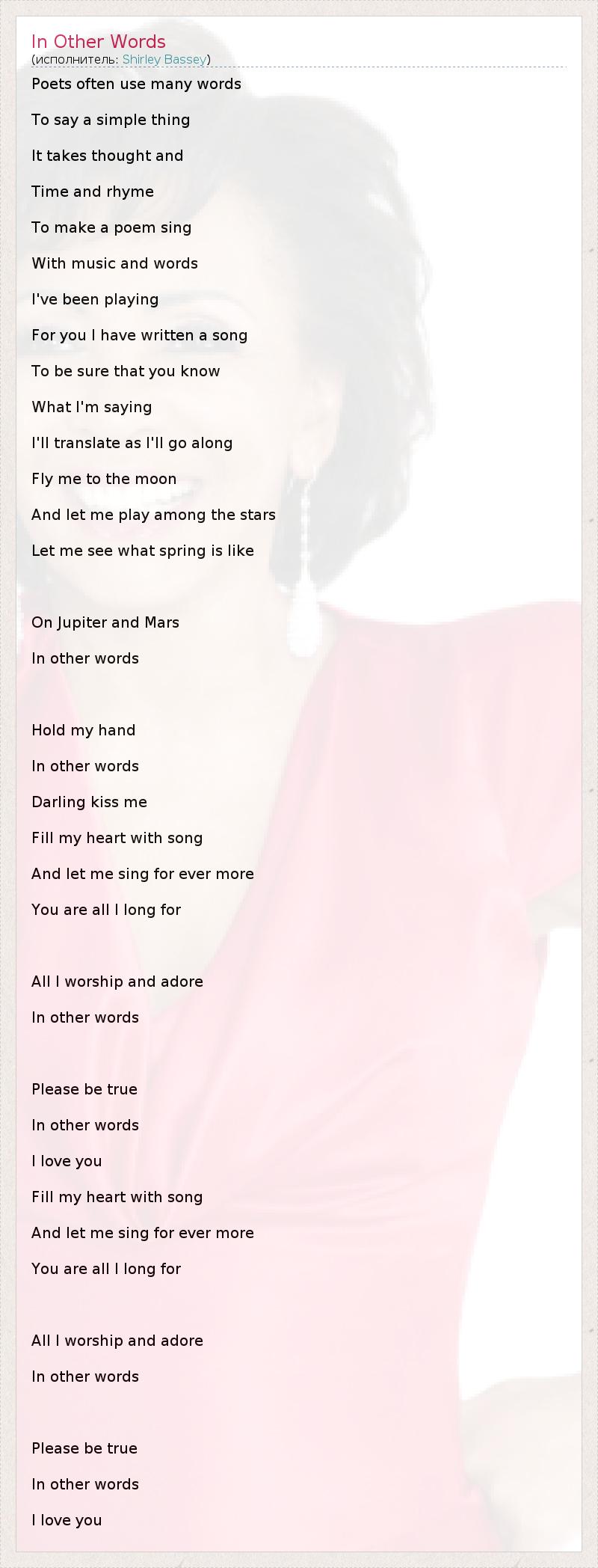 Это интересно:Ширли Вероника Бэсси (англ. Shirley Veronica Bassey; родилась 8 января 1937, Кардифф, Уэльс) — британская певица, ставшая известной за пределами своей родины после исполнения песен к фильмам о Джеймсе Бонде: «Голдфингер» (1964), «Бриллианты остаются навсегда» (1971) и «Мунрэйкер» (1979). Она единственная записала более одной темы к фильмам о Джеймсе Бонде. Награждена орденом Британской империи. В 2003 году певица... продолжение