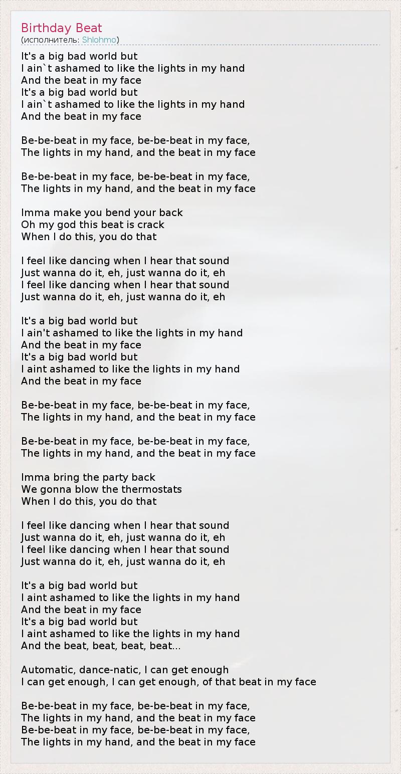 It's a big bad world but I ain`t ashamed to like the lights in my hand And the beat in my face It's a big bad world but I ain`t ashamed to like the lights in my hand And the beat in my face Be-be-beat in my face, be-be-beat in my face, The lights in my hand, and the beat in my face Be-be-beat in my face, be-be-beat in my face, The lights in my hand, and the beat in my face Imma make you bend your back Oh my god this beat is crack When I do this, you do that I feel like dancing when I hear that sound Just wanna do it, eh, just wanna do it, eh I feel like dancing when I hear that sound Just wanna do it, eh, just wanna do it, eh It's a big bad world but I ain't ashamed to like the lights in my hand And the beat in my face It's a big bad world but I aint ashamed to like the lights in my hand And the beat in my face Be-be-beat in my face, be-be-beat in my face, The lights in my hand, and the beat in my face Be-be-beat in my face, be-be-beat in my face, The lights in my hand, and the beat in my face Imma bring the party back We gonna blow the thermostats When I do this, you do that I feel like dancing when I hear that sound Just wanna do it, eh, just wanna do it, eh I feel like dancing when I hear that sound Just wanna do it, eh, just wanna do it, eh It's a big bad world but I aint ashamed to like the lights in my hand And the beat in my face It's a big bad world but I aint ashamed to like the lights in my hand And the beat, beat, beat, beat... Automatic, dance-natic, I can get enough I can get enough, I can get enough, of that beat in my face Be-be-beat in my face, be-be-beat in my face, The lights in my hand, and the beat in my face Be-be-beat in my face, be-be-beat in my face, The lights in my hand, and the beat in my face