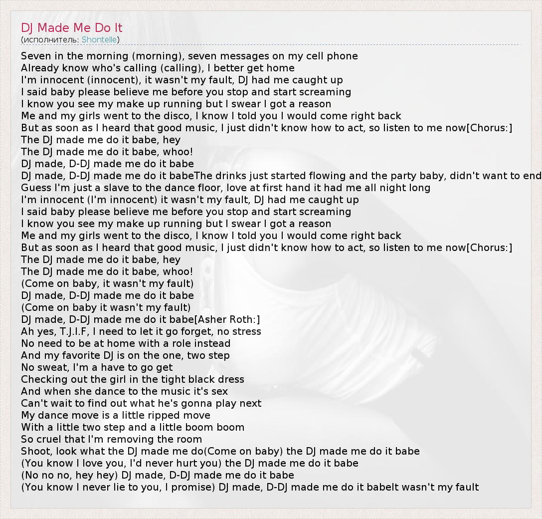 Seven in the morning (morning), seven messages on my cell phone Already know who's calling (calling), I better get home I'm innocent (innocent), it wasn't my fault, DJ had me caught up I said baby please believe me before you stop and start screaming I know you see my make up running but I swear I got a reason Me and my girls went to the disco, I know I told you I would come right back But as soon as I heard that good music, I just didn't know how to act, so listen to me now[Chorus:] The DJ made me do it babe, hey The DJ made me do it babe, whoo! DJ made, D-DJ made me do it babe DJ made, D-DJ made me do it babeThe drinks just started flowing and the party baby, didn't want to end Guess I'm just a slave to the dance floor, love at first hand it had me all night long I'm innocent (I'm innocent) it wasn't my fault, DJ had me caught up I said baby please believe me before you stop and start screaming I know you see my make up running but I swear I got a reason Me and my girls went to the disco, I know I told you I would come right back But as soon as I heard that good music, I just didn't know how to act, so listen to me now[Chorus:] The DJ made me do it babe, hey The DJ made me do it babe, whoo! (Come on baby, it wasn't my fault) DJ made, D-DJ made me do it babe (Come on baby it wasn't my fault) DJ made, D-DJ made me do it babe[Asher Roth:] Ah yes, T.J.I.F, I need to let it go forget, no stress No need to be at home with a role instead And my favorite DJ is on the one, two step No sweat, I'm a have to go get Checking out the girl in the tight black dress And when she dance to the music it's sex Can't wait to find out what he's gonna play next My dance move is a little ripped move With a little two step and a little boom boom So cruel that I'm removing the room Shoot, look what the DJ made me do(Come on baby) the DJ made me do it babe (You know I love you, I'd never hurt you) the DJ made me do it babe (No no no, hey hey) DJ made, D-DJ made me do it babe (You know I never lie to you, I promise) DJ made, D-DJ made me do it babeIt wasn't my fault