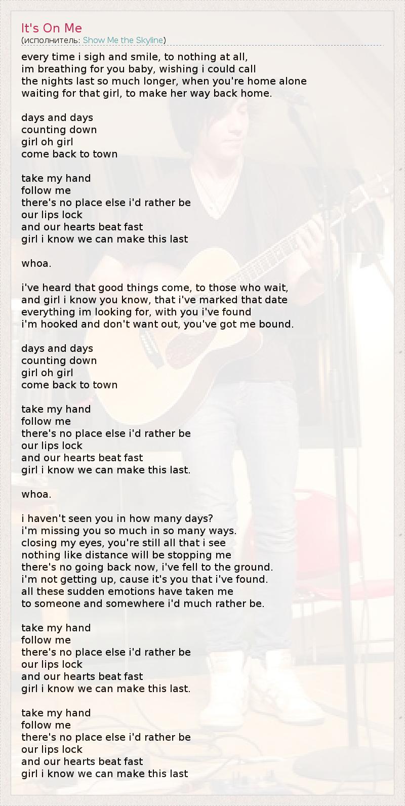every time i sigh and smile, to nothing at all, im breathing for you baby, wishing i could call the nights last so much longer, when you're home alone waiting for that girl, to make her way back home. days and days counting down girl oh girl come back to town take my hand follow me there's no place else i'd rather be our lips lock and our hearts beat fast girl i know we can make this last whoa. i've heard that good things come, to those who wait, and girl i know you know, that i've marked that date everything im looking for, with you i've found i'm hooked and don't want out, you've got me bound. days and days counting down girl oh girl come back to town take my hand follow me there's no place else i'd rather be our lips lock and our hearts beat fast girl i know we can make this last. whoa. i haven't seen you in how many days? i'm missing you so much in so many ways. closing my eyes, you're still all that i see nothing like distance will be stopping me there's no going back now, i've fell to the ground. i'm not getting up, cause it's you that i've found. all these sudden emotions have taken me to someone and somewhere i'd much rather be. take my hand follow me there's no place else i'd rather be our lips lock and our hearts beat fast girl i know we can make this last. take my hand follow me there's no place else i'd rather be our lips lock and our hearts beat fast girl i know we can make this last