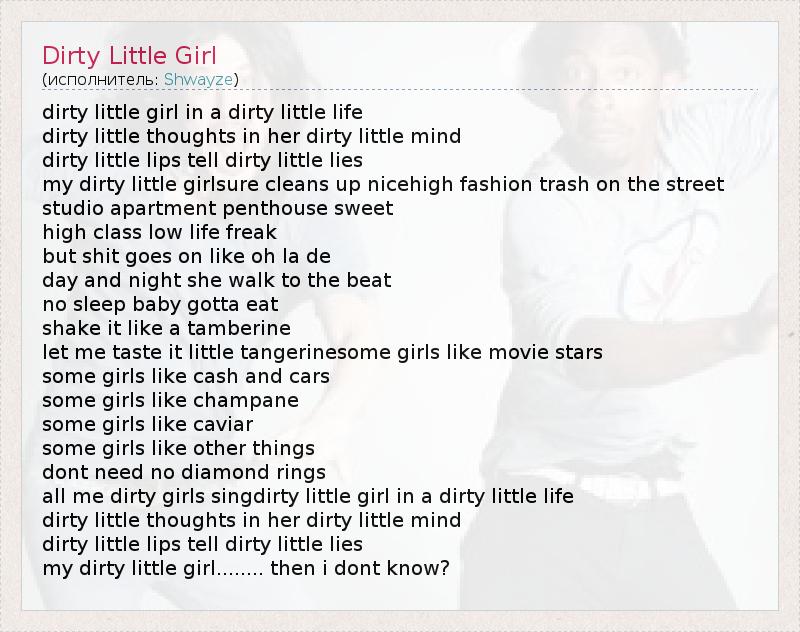 dirty little girl in a dirty little life dirty little thoughts in her dirty little mind dirty little lips tell dirty little lies my dirty little girlsure cleans up nicehigh fashion trash on the street studio apartment penthouse sweet high class low life freak but shit goes on like oh la de day and night she walk to the beat no sleep baby gotta eat shake it like a tamberine let me taste it little tangerinesome girls like movie stars some girls like cash and cars some girls like champane some girls like caviar some girls like other things dont need no diamond rings all me dirty girls singdirty little girl in a dirty little life dirty little thoughts in her dirty little mind dirty little lips tell dirty little lies my dirty little girl........ then i dont know?