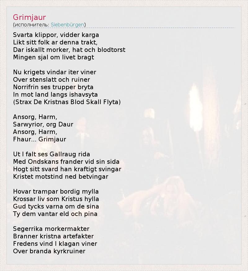 Svarta klippor, vidder karga Likt sitt folk ar denna trakt, Dar iskallt morker, hat och blodtorst Mingen sjal om livet bragt Nu krigets vindar iter viner Over stenslatt och ruiner Norrifrin ses trupper bryta In mot land langs ishavsyta (Strax De Kristnas Blod Skall Flyta) Ansorg, Harm, Sarwyrior, org Daur Ansorg, Harm, Fhaur... Grimjaur Ut I falt ses Gallraug rida Med Ondskans frander vid sin sida Hogt sitt svard han kraftigt svingar Kristet motstind ned betvingar Hovar trampar bordig mylla Krossar liv som Kristus hylla Gud tycks varna om de sina Ty dem vantar eld och pina Segerrika morkermakter Branner kristna artefakter Fredens vind I klagan viner Over branda kyrkruiner