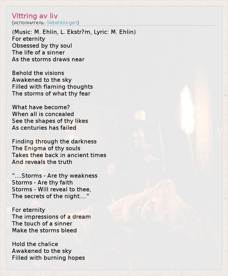 Это интересно:Группа Siebenbürgen была создана Marcus Ehlin и Anders Rosdahl в 1994 году. Через несколько месяцев появился Fredrik Brockert. О названии (и далее — цитаты из интервью с Маркусом):"По правде, это моя бывшая подружка подкинула нам идею. Полагаю, что это подходило нам как нельзя лучше, учитывая нашу излюбленную вампирскую тематику в лирике, которую мы тогда писали сугубо на шведском. Siebenbürgen — пару сотен лет назад... продолжение