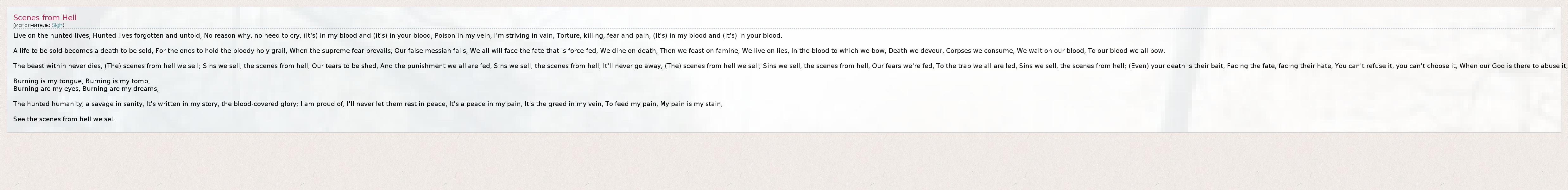 The beast within never dies, (The) scenes from hell we sell; Sins we sell, the scenes from hell, Our tears to be shed, And the punishment we all are fed, Sins we sell, the scenes from hell, It'll never go away, (The) scenes from hell we sell; Sins we sell, the scenes from hell, Our fears we're fed, To the trap we all are led, Sins we sell, the scenes from hell; (Even) your death is their bait, Facing the fate, facing their hate, You can't refuse it, you can't choose it, When our God is there to abuse it,