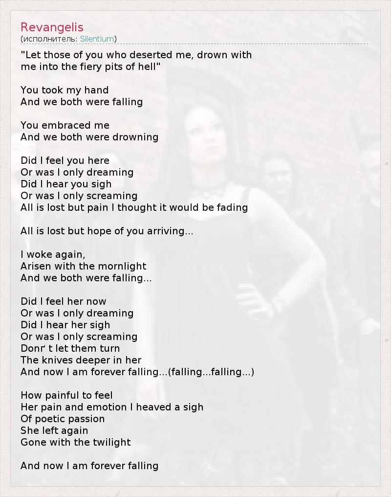 "Let those of you who deserted me, drown with me into the fiery pits of hell" You took my hand And we both were falling You embraced me And we both were drowning Did I feel you here Or was I only dreaming Did I hear you sigh Or was I only screaming All is lost but pain I thought it would be fading All is lost but hope of you arriving... I woke again, Arisen with the mornlight And we both were falling... Did I feel her now Or was I only dreaming Did I hear her sigh Or was I only screaming Donґ t let them turn The knives deeper in her And now I am forever falling...(falling...falling...) How painful to feel Her pain and emotion I heaved a sigh Of poetic passion She left again Gone with the twilight And now I am forever falling
