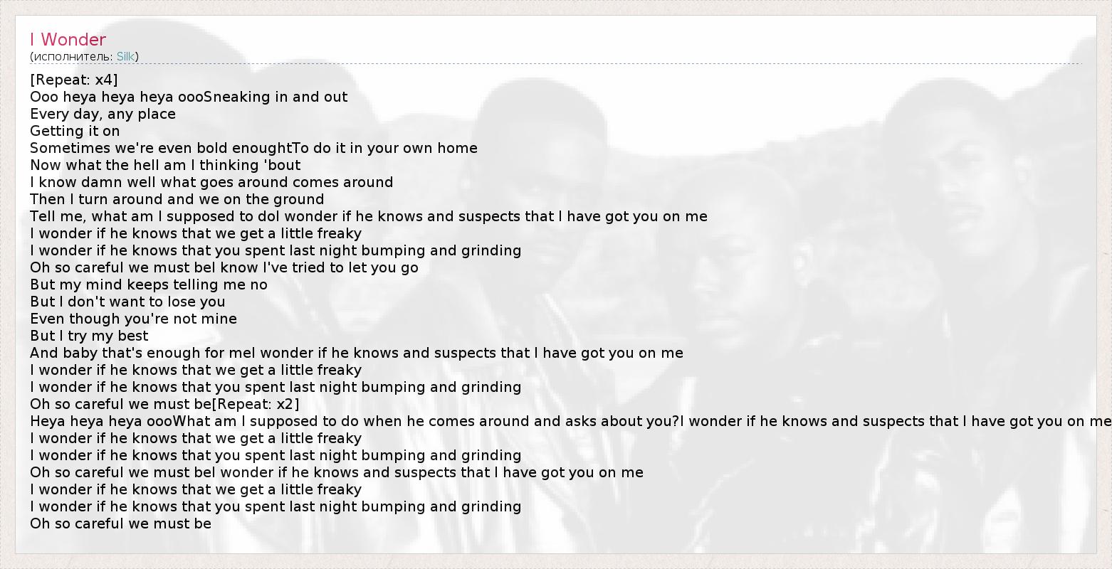 [Repeat: x4] Ooo heya heya heya oooSneaking in and out Every day, any place Getting it on Sometimes we're even bold enoughtTo do it in your own home Now what the hell am I thinking 'bout I know damn well what goes around comes around Then I turn around and we on the ground Tell me, what am I supposed to doI wonder if he knows and suspects that I have got you on me I wonder if he knows that we get a little freaky I wonder if he knows that you spent last night bumping and grinding Oh so careful we must beI know I've tried to let you go But my mind keeps telling me no But I don't want to lose you Even though you're not mine But I try my best And baby that's enough for meI wonder if he knows and suspects that I have got you on me I wonder if he knows that we get a little freaky I wonder if he knows that you spent last night bumping and grinding Oh so careful we must be[Repeat: x2] Heya heya heya oooWhat am I supposed to do when he comes around and asks about you?I wonder if he knows and suspects that I have got you on me I wonder if he knows that we get a little freaky I wonder if he knows that you spent last night bumping and grinding Oh so careful we must beI wonder if he knows and suspects that I have got you on me I wonder if he knows that we get a little freaky I wonder if he knows that you spent last night bumping and grinding Oh so careful we must be