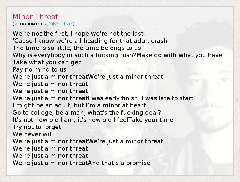 We're not the first, I hope we're not the last 'Cause I know we're all heading for that adult crash The time is so little, the time belongs to us Why is everybody in such a fucking rush?Make do with what you have Take what you can get Pay no mind to us We're just a minor threatWe're just a minor threat We're just a minor threat We're just a minor threat We're just a minor threatI was early finish, I was late to start I might be an adult, but I'm a minor at heart Go to college, be a man, what's the fucking deal? It's not how old I am, it's how old I feelTake your time Try not to forget We never will We're just a minor threatWe're just a minor threat We're just a minor threat We're just a minor threat We're just a minor threatAnd that's a promise