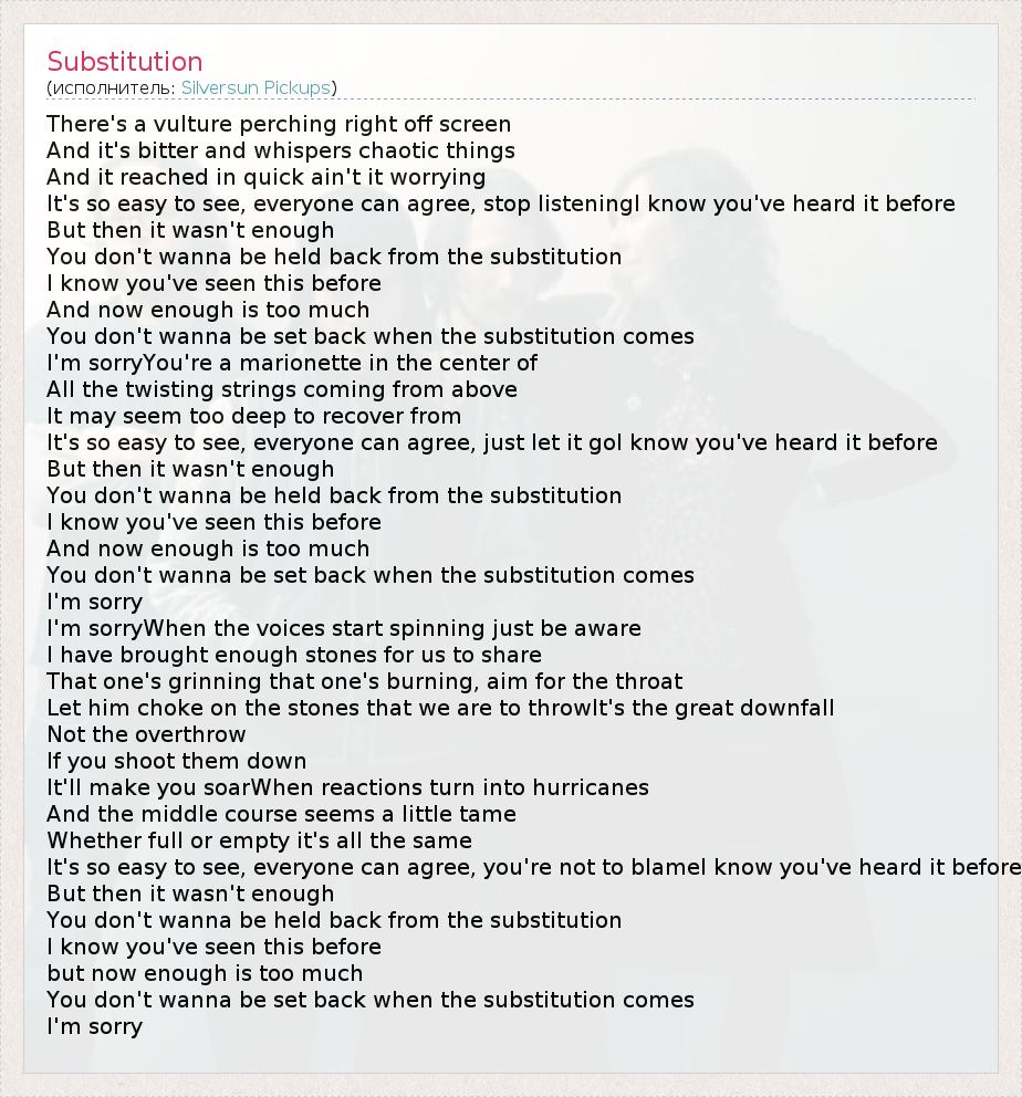 There's a vulture perching right off screen And it's bitter and whispers chaotic things And it reached in quick ain't it worrying It's so easy to see, everyone can agree, stop listeningI know you've heard it before But then it wasn't enough You don't wanna be held back from the substitution I know you've seen this before And now enough is too much You don't wanna be set back when the substitution comes I'm sorryYou're a marionette in the center of All the twisting strings coming from above It may seem too deep to recover from It's so easy to see, everyone can agree, just let it goI know you've heard it before But then it wasn't enough You don't wanna be held back from the substitution I know you've seen this before And now enough is too much You don't wanna be set back when the substitution comes I'm sorry I'm sorryWhen the voices start spinning just be aware I have brought enough stones for us to share That one's grinning that one's burning, aim for the throat Let him choke on the stones that we are to throwIt's the great downfall Not the overthrow If you shoot them down It'll make you soarWhen reactions turn into hurricanes And the middle course seems a little tame Whether full or empty it's all the same It's so easy to see, everyone can agree, you're not to blameI know you've heard it before But then it wasn't enough You don't wanna be held back from the substitution I know you've seen this before but now enough is too much You don't wanna be set back when the substitution comes I'm sorry