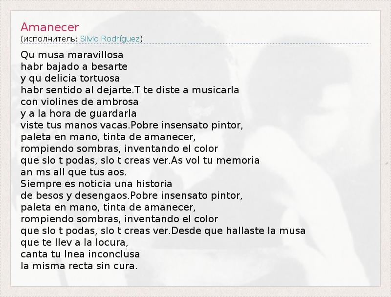 Это интересно:Си́львио Родри́гес Доми́нгес (исп. Silvio Rodríguez Domínguez; Сан-Антонио-де-Лос-Баньос, Куба, 29 ноября 1946) — кубинский музыкант, поэт и певец, oдин из основателей (наряду с Ноэлем Николой и Пабло Миланесом) кубинского песенного движения Новая Трова.За более чем 40 лет поэтического и музыкального творчества Сильвио Родригес написал огромное количество песен (от 600 до 1000, точная цифра неизвестна),... продолжение