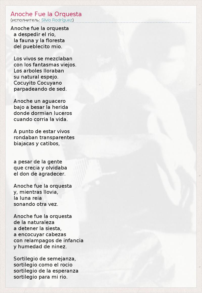 Anoche fue la orquesta a despedir el rio, la fauna y la floresta del pueblecito mio. Los vivos se mezclaban con los fantasmas viejos. Los arboles lloraban su natural espejo. Cocuyito Cocuyano parpadeando de sed. Anoche un aguacero bajo a besar la herida donde dormian luceros cuando corria la vida. A punto de estar vivos rondaban transparentes biajacas y catibos, a pesar de la gente que crecia y olvidaba el don de agradecer. Anoche fue la orquesta y, mientras llovia, la luna reia sonando otra vez. Anoche fue la orquesta de la naturaleza a detener la siesta, a encocuyar cabezas con relampagos de infancia y humedad de ninez. Sortilegio de semejanza, sortilegio como el rocio sortilegio de la esperanza sortilegio para mi rio.