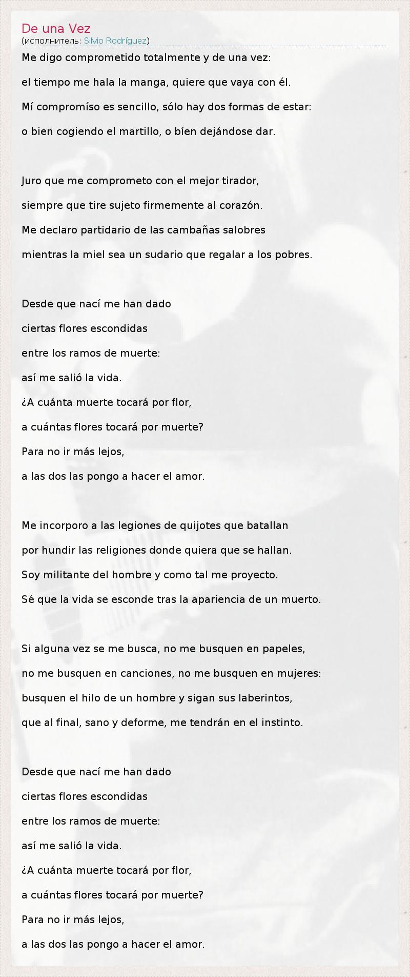 Это интересно:Си́львио Родри́гес Доми́нгес (исп. Silvio Rodríguez Domínguez; Сан-Антонио-де-Лос-Баньос, Куба, 29 ноября 1946) — кубинский музыкант, поэт и певец, oдин из основателей (наряду с Ноэлем Николой и Пабло Миланесом) кубинского песенного движения Новая Трова.За более чем 40 лет поэтического и музыкального творчества Сильвио Родригес написал огромное количество песен (от 600 до 1000, точная цифра неизвестна),... продолжение