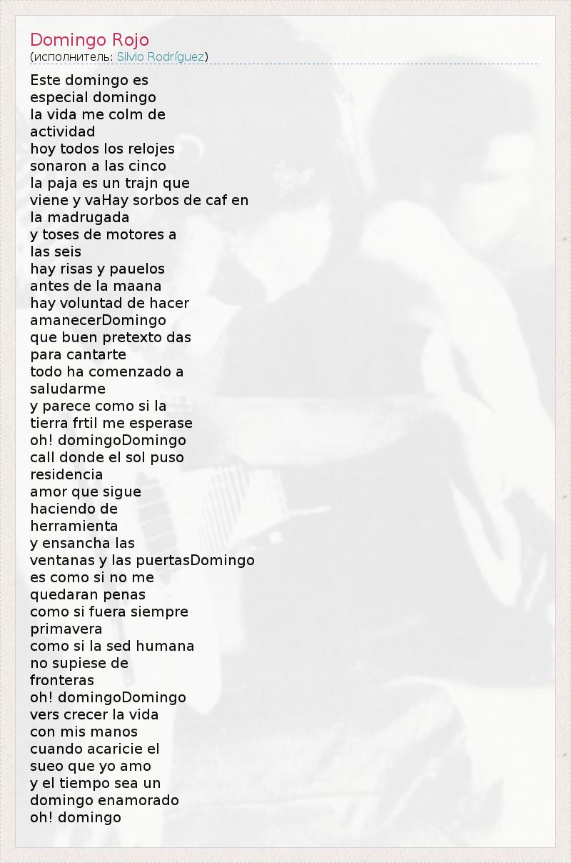 Este domingo es especial domingo la vida me colm de actividad hoy todos los relojes sonaron a las cinco la paja es un trajn que viene y vaHay sorbos de caf en la madrugada y toses de motores a las seis hay risas y pauelos antes de la maana hay voluntad de hacer amanecerDomingo que buen pretexto das para cantarte todo ha comenzado a saludarme y parece como si la tierra frtil me esperase oh! domingoDomingo call donde el sol puso residencia amor que sigue haciendo de herramienta y ensancha las ventanas y las puertasDomingo es como si no me quedaran penas como si fuera siempre primavera como si la sed humana no supiese de fronteras oh! domingoDomingo vers crecer la vida con mis manos cuando acaricie el sueo que yo amo y el tiempo sea un domingo enamorado oh! domingo