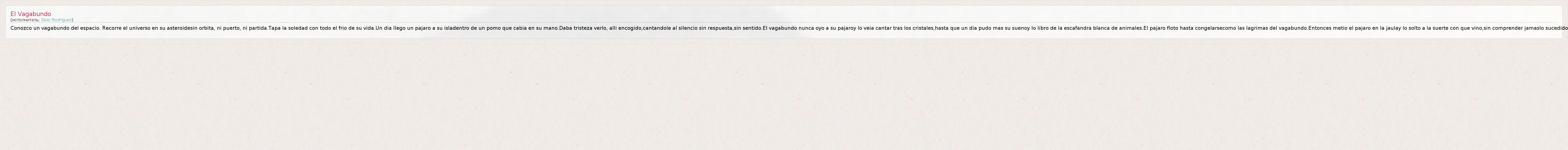 Conozco un vagabundo del espacio. Recorre el universo en su asteroidesin orbita, ni puerto, ni partida.Tapa la soledad con todo el frio de su vida.Un dia llego un pajaro a su isladentro de un pomo que cabia en su mano.Daba tristeza verlo, alli encogido,cantandole al silencio sin respuesta,sin sentido.El vagabundo nunca oyo a su pajaroy lo veia cantar tras los cristales,hasta que un dia pudo mas su suenoy lo libro de la escafandra blanca de animales.El pajaro floto hasta congelarsecomo las lagrimas del vagabundo.Entonces metio el pajaro en la jaulay lo solto a la suerte con que vino,sin comprender jamaslo sucedido