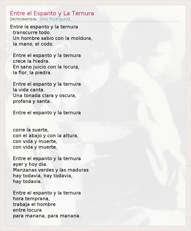 Entre le espanto y la ternura transcurre todo. Un hombre sabio con la moldura, la mano, el codo. Entre el espanto y la ternura crece la hiedra. En sano juicio con la locura, la flor, la piedra. Entre el espanto y la ternura la vida canta. Una tonada clara y oscura, profana y santa. Entre el espanto y la ternura corre la suerte, con el abajo y con la altura, con vida y muerte, con vida y muerte. Entre el espanto y la ternura ayer y hoy dia. Manzanas verdes y las maduras hay todavia, hay todavia, hay todavia. Entre el espanto y la ternura hora temprana, trabaja el hombre entre locura para manana, para manana.