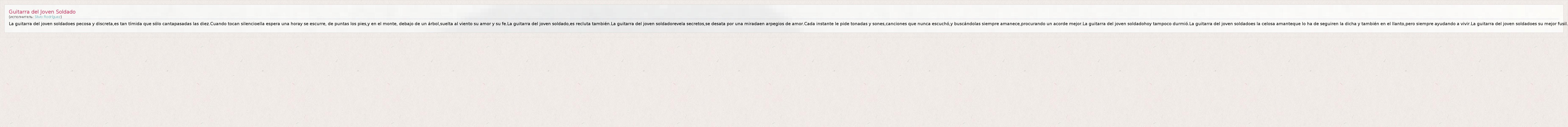 La guitarra del joven soldadoes pecosa y discreta,es tan tímida que sólo cantapasadas las diez.Cuando tocan silencioella espera una horay se escurre, de puntas los pies,y en el monte, debajo de un árbol,suelta al viento su amor y su fe.La guitarra del joven soldado,es recluta también.La guitarra del joven soldadorevela secretos,se desata por una miradaen arpegios de amor.Cada instante le pide tonadas y sones,canciones que nunca escuchó,y buscándolas siempre amanece,procurando un acorde mejor.La guitarra del joven soldadohoy tampoco durmió.La guitarra del joven soldadoes la celosa amanteque lo ha de seguiren la dicha y también en el llanto,pero siempre ayudando a vivir.La guitarra del joven soldadoes su mejor fusil.